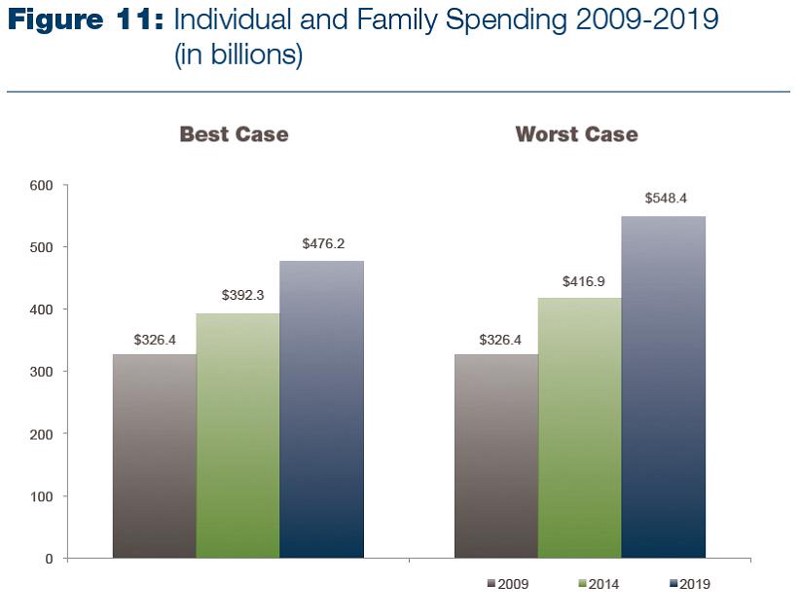 Under an intermediate or worst case scenario (in which fewer workers have jobs and comprehensive insurance, more uninsured burden the system, and health care costs continue to spiral upwards), they project individual and family spending on health care to increase 50% in an intermediate case scenario or almost 60% in their worst case scenario.