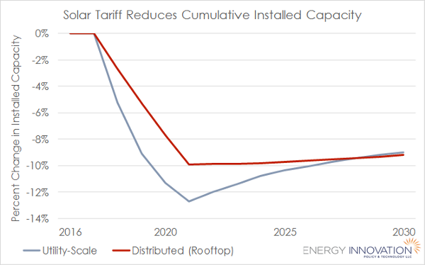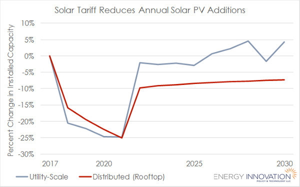 Analysts have warned that imposing tariffs on foreign-made solar panels will dramatically reduce installations. Between 2017 and 2021, annual installation of solar PV will fall 25 percent. Cumulatively, that means overall solar installations will be about 10 percent lower than currently expected, over the longer term.