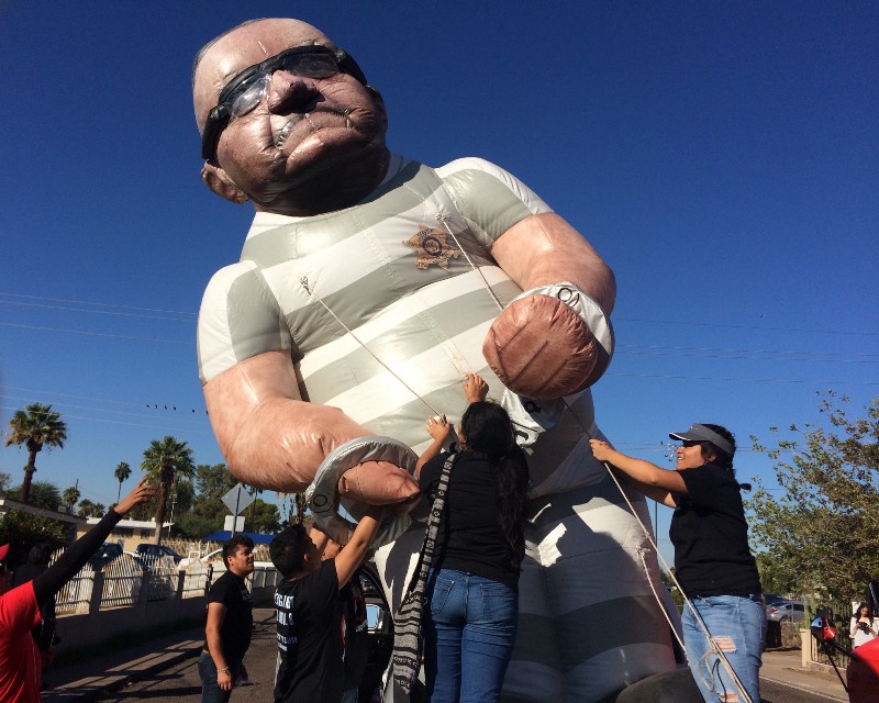 In front was a rickety school bus painted red, blasting cumbia music, its windows bearing scribbled messages urging onlookers to “Vote Against Hate on November 8.” Behind it rolled a white pickup truck, and in its bed stood a massive, inflatable effigy of Maricopa County Sheriff Joe Arpaio wearing prison stripes and a pair of handcuffs.