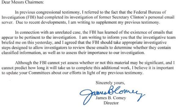 So what we now know is that Comey delivered this letter, not because the FBI uncovered some new bombshell, but because he was under a legal obligation to do so. We also know that the emails were not from Clinton. Additionally, the AP reports that the emails “did not come from her private server.”