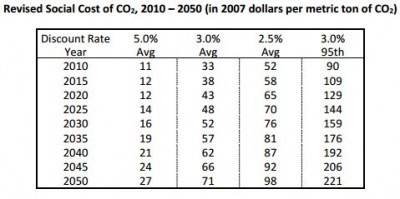 This year’s Economic Report of the President [archived here] defined the “social cost of carbon” as a monetized estimate of the damages caused by emitting an additional ton of carbon dioxide in one year. These damages cover “health, property damage, agricultural impacts, the value of ecosystem services, and other welfare costs of climate change.” Heather Zichal, President Obama’s top climate advisor, explained that these values “draw on the best available science to calculate the benefits of reducing greenhouse gas emissions.”