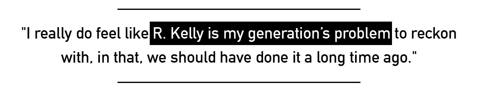 I said this in another interview but it’s true: I really do feel like R. Kelly is my generation’s problem to reckon with, in that, we should have done it a long time ago. So I’m happy to take on that labor while they take on all the other labor.