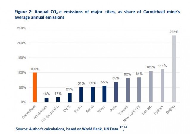“With the international community grappling with the urgent demand for coordinated reductions in greenhouse gas emissions, Adani’s coal mine threatens to undermine the effectiveness of nation’s climate mitigation strategies,” the report’s authors write. “To maximise the international community’s likelihood for success on reducing greenhouse gas emissions, Carmichael’s coal product must remain unburnt.”