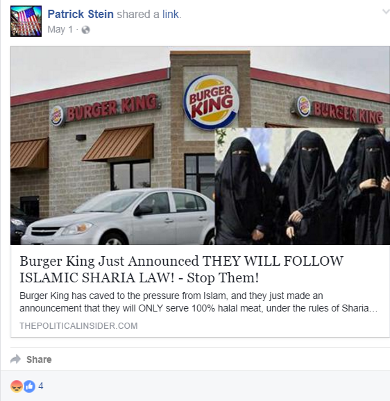 Stein, for instance, shared material from Russian propaganda and “Anonymous News” sites, claiming the September 11 attacks were “[d]efinitely an inside job.” He likewise posted material from any number of other popular fake news sites, including “Veterans Today” and “The Political Insider.”
