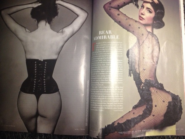 In an article comically entitled “Rear Admirable,” Vanity Fair showcases social media sensation Jen Selter, who skyrocketed to fame after posting photos of her butt on Instagram. The pictures used in the spread include a backside shot of Selter in a black corset, and another of the model in 1940s-inspired, fishnet lingerie. The accompanying text describes Selter as a “member of a rapidly rising subset of Instagram stars: young women unfraid to share their deeply bronzed, sculpted figures.”