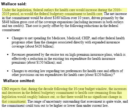 Wallace’s claim that the bill “fails to bend the famous health care cost curve” is also inaccurate. The legislation establishes an Independent Medicare Advisory Board (IMAB)– which is required to “recommend changes to the Medicare program to limit the rate of growth in that program’s spending” — and places a 40% excise tax on insurers that offer expensive policies. While the budget office did not analyze the effect of the legislation on national health expenditures, the CBO is predicting that spending per Medicare beneficiary would decrease, as compared to the growth rate of the past two decades (from 8% growth rate to 6% growth rate).