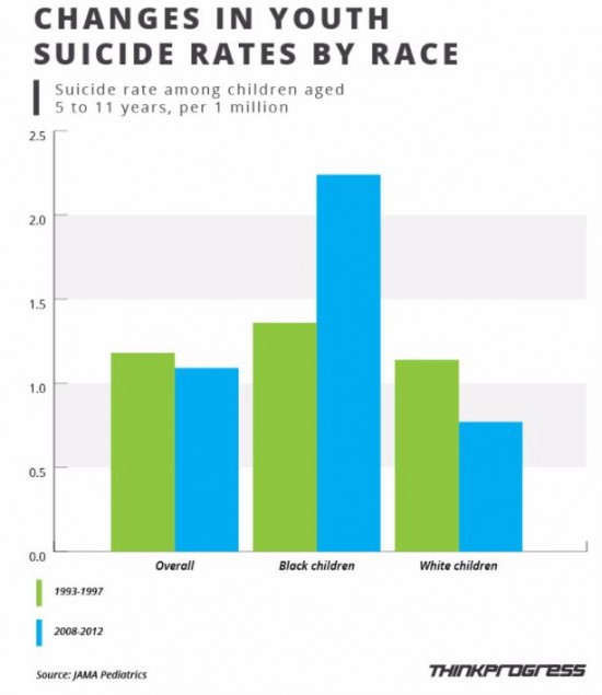 A 2015 study from the Centers for Disease Control and Prevention found that for the first time, the suicide rate of black children in between the ages of 5 and 11 had doubled between 1993 and 2013 — while the rate among white children had declined. Suicides by hanging nearly tripled among black boys in particular. These findings were so surprising to researchers that they spent an extra year re-analyzing data just to double check themselves, only to find the same results.