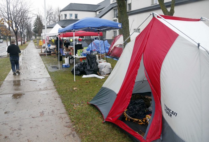 Members of Black Lives Matter continue their encampment, Tuesday, Nov. 17, 2015, outside the Minneapolis Police Department’s Fourth Precinct. More than 50 people were arrested during the second day of protests over the shooting of Jamar Clark by a police officer during an apparent struggle. (AP Photo/Jim Mone)