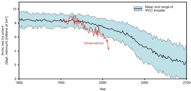 Figure 2: Observed vs. IPCC modeled annual minimum Arctic sea ice extent