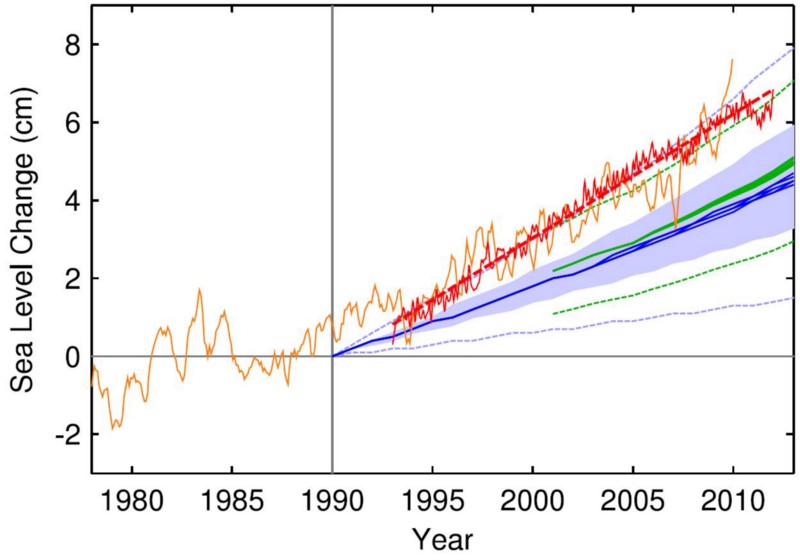For example, Rahmstorf (2007) and more recently Rahmstorf et al. (2012) showed that sea level is rising at a rate inconsistent with all but the highest IPCC scenarios (Figure 1). Rahmstorf et al. (2012) concluded,