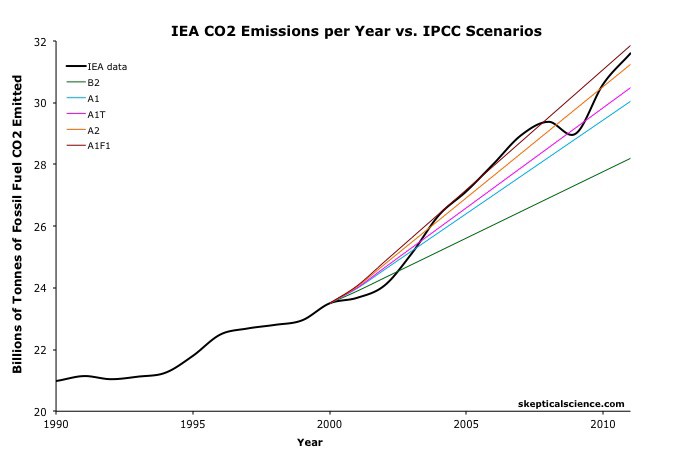 Figure 3: IEA fossil fuel CO2 emissions estimates vs. IPCC SRES emissions scenarios.