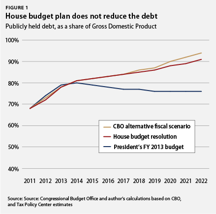 As CAP’s Michael Linden has pointed out, “with all the House budget’s tax cuts properly accounted for, revenue would average just 15.3 percent of GDP from 2013 through 2022, not 18.3 percent. The result: deficits would never drop below 4.4 percent of GDP, and would rise to more than 5 percent of GDP by 2022.”