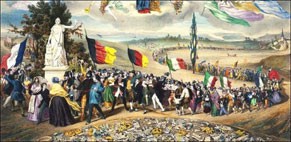Similarly, the demonstration effect of Tunisia was essential in encouraging others in the region to take similar action. Tunisia created an example of a successful popular uprising that became a major motivating factor for other demonstrators around the region, especially in Egypt. After all, if it could happen there, why couldn’t it happen here? Once Egyptian President Hosni Mubarak stepped down, this only added further energy to protests in Bahrain, Yemen, Jordan, Iran and Libya. In the Middle East, it’s clear the demonstration effect has been pronounced. This is a common trait of revolutionary years. In the photo above, anti-monarchist revolutionaries in France, Germany, and Italy, while distinct groups, are portrayed as all marching together (also note the vertical stripes of the German anti-monarchist flag that was inspired by the vertical stripes of the republican French tri-color). Popular uprisings inspire each other.